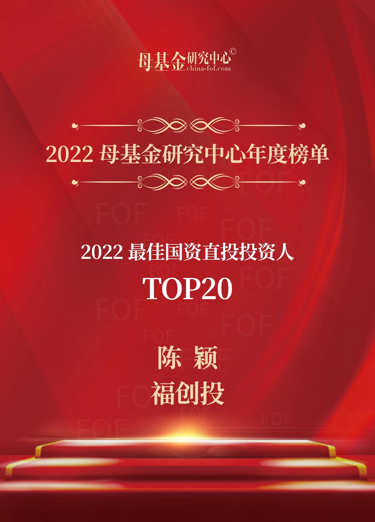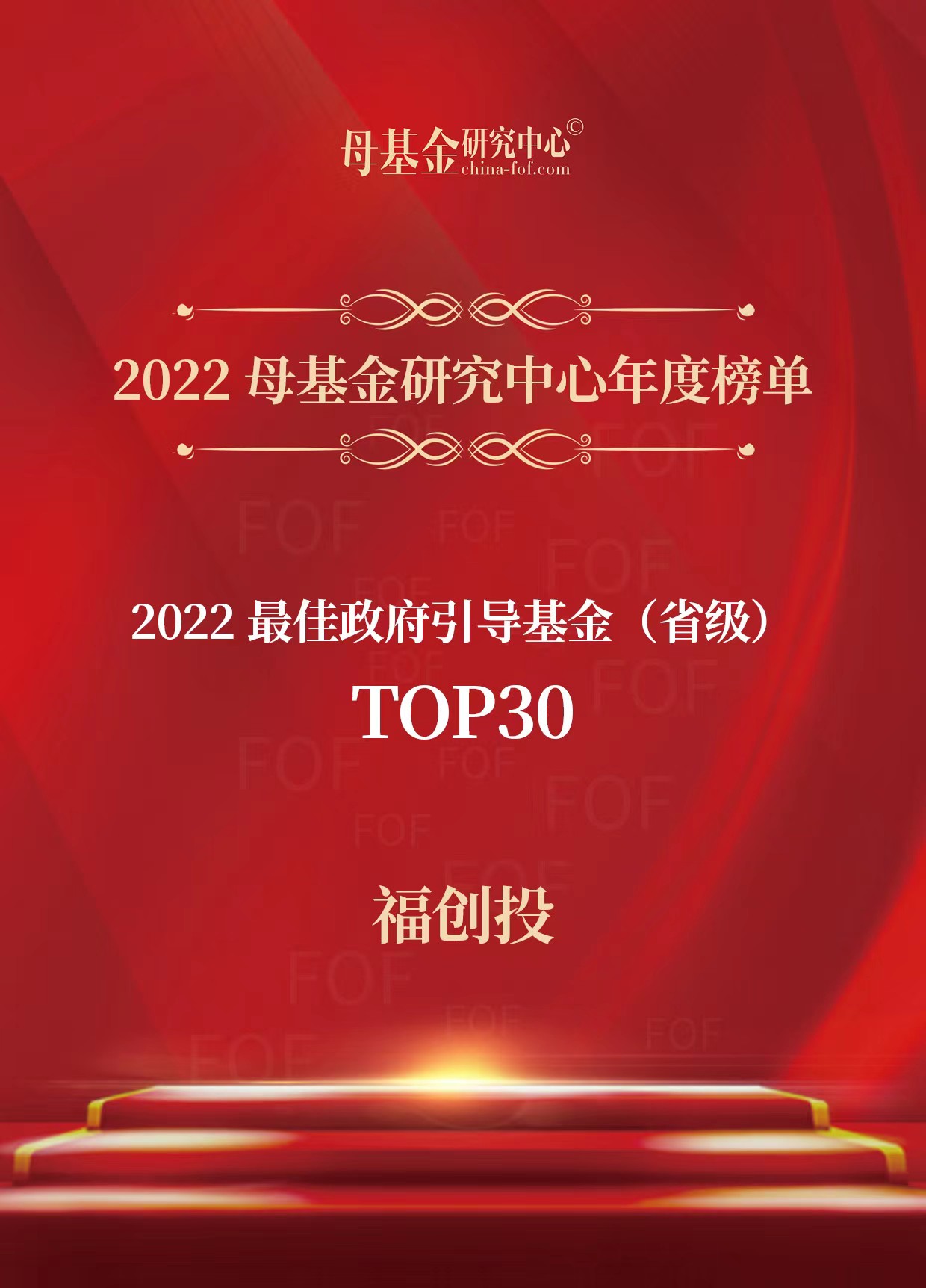 1月7日,母基金研究中心正式發(fā)布2022年度榜單。福創(chuàng)投榮登“2022最佳政府引導(dǎo)基金(省級)TOP 30”,位列第9位;福創(chuàng)投董事長陳穎同志榮登“2022最佳國資直投投資人TOP 20”,位列第7位。