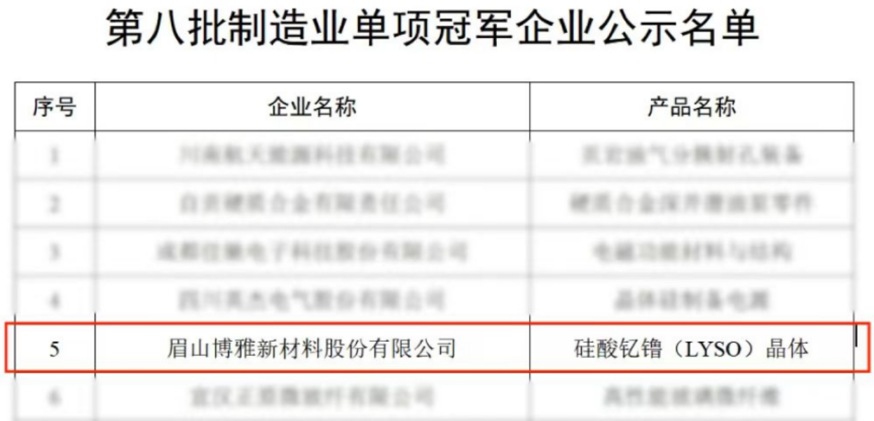此外,工業和信息化部完成了第八批制造業單項冠軍企業遴選認定工作,博雅新材的硅酸釔镥(LYSO)晶體產品成功入選。