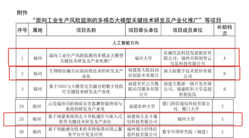 近日,福建省工業和信息化廳公布了“2024年福建省軟件業技術創新重點攻關及產業化項目(第三批)”名單,福創投3家已投企業——長威信息科技發展股份有限公司、新大陸數字技術股份有限公司和福建福大北斗通信科技有限公司參與的項目成功入選。